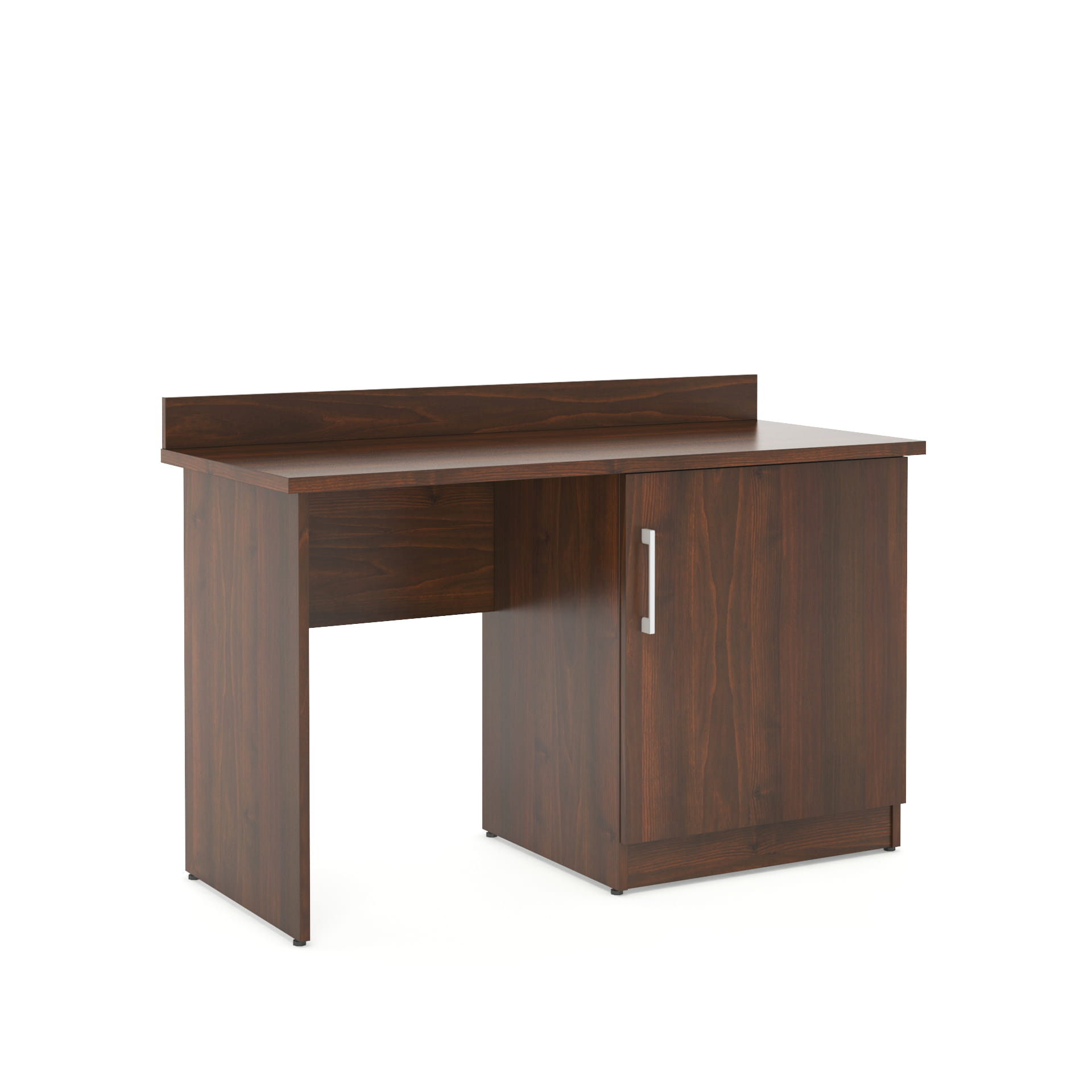 Biurko z szafką i panelem chroniącym ścianę przed zabrudzeniami.