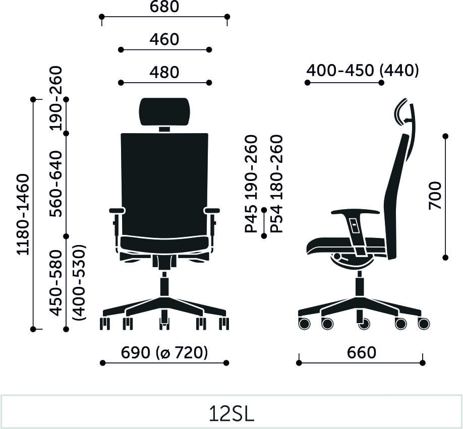 P54PU - podłokietnik regulowany góra-dół (zakres regulacji 80 mm). Kolor stelaża podłokietnika: czarny.