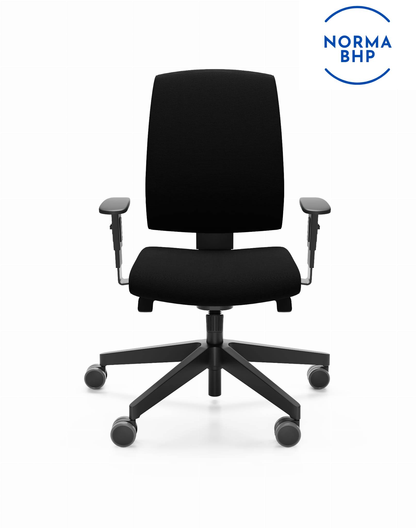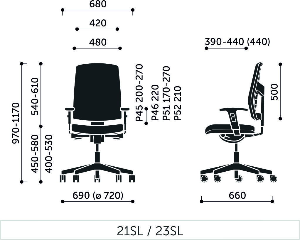 P45PU - podłokietnik regulowany góra-dół (zakres regulacji 70 mm), nakładka poliuretanowa. Kolor stelaża podłokietnika: czarny.