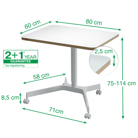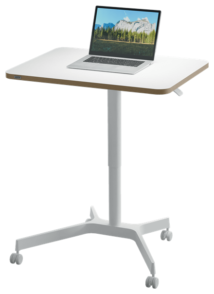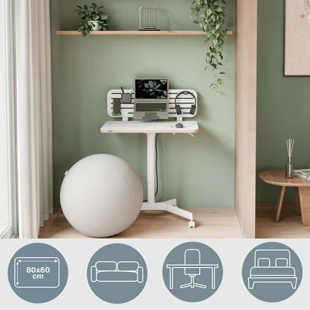 Siedź - Stój - Ruszaj się. Niezależnie od tego, czy chcesz zadbać o zdrowie w czasie pracy, czy szukasz ergonomicznego rozwiązania, które pozwoli Ci uniknąć bólu, nasze niewielkich rozmiarów mobilne biurko do pracy na stojąco i siedząco zaprojektowano tak, aby ulepszyć i wynieść Twoje miejsce pracy na nowy poziom. Kompaktowa konstrukcja z blatem o wymiarach 80 x 60 cm umożliwia elastyczne użytkowanie biurka jako biurka tymczasowego w miejscach o ograniczonej przestrzeni. Idealnie sprawdzi się w domowym biurze lub w biurach ze współdzielonymi miejscami pracy, pozwala na ustawienie laptopa, klawiatury i innych akcesoriów, np. podpórki pod nadgarstki lub podkładki pod mysz.