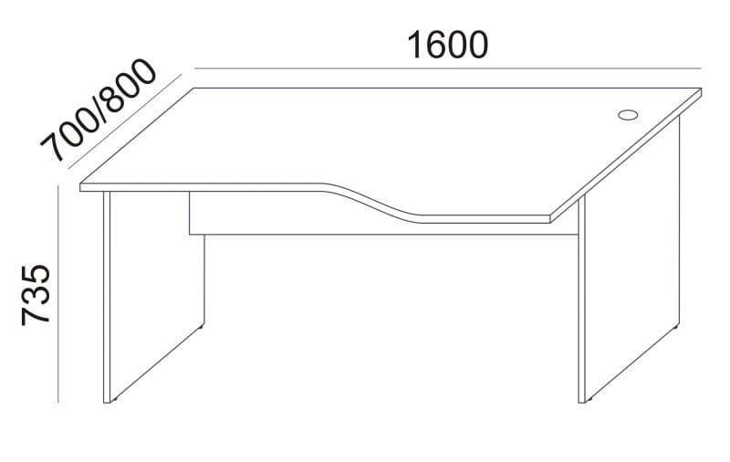 Biurko do pracy z blatem profilowanym – kształtowym. Biurko SV-23 o wymiarach: szerokość:160cm, głębokość: 70/80cm, wysokość: 73,5cm. Biurko posiada blat o grubości 25mm, wykończony obrzeżem 2mm firmy Rehau. Nogi oraz blenda wykonane z płyty o grubości 18mm. Regulatory poziomujące krzywiznę podłogi – do 15mm. Płyta melaminowana, klasa higieniczności E0,5, producent Kronospan. W blacie okrągła przelotka na kable. Waga biurka – ok. 40kg