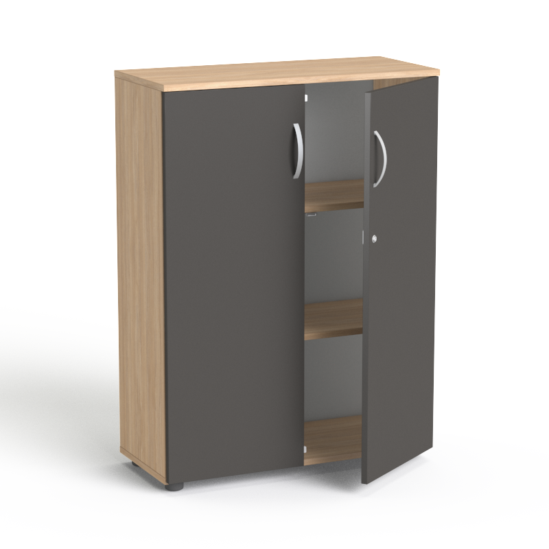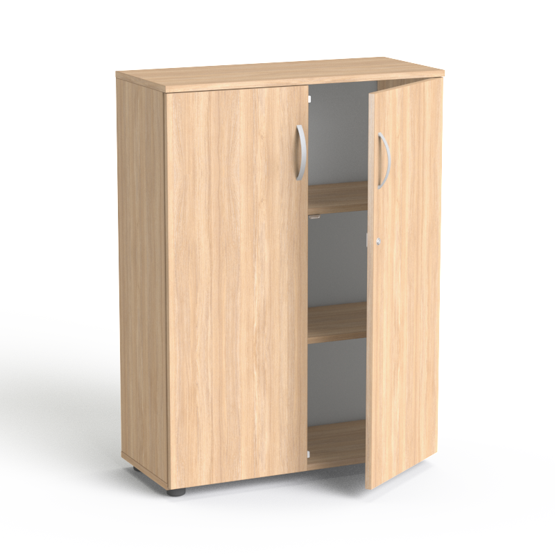 Szafka SV-06 waży około 36 kg. Wymiary zewnętrzne to: szerokość: 80 cm, głębokość: 35,5 cm oraz wysokość: 109 cm Płyta melaminowana, klasa higieniczności E1, producent Kronospan Wieniec górny o grubości 18mm wykończony obrzeżem PCV firmy Rehau Regulatory poziomu w nodze niwelujące nierówności podłogi Trzy przestrzenie na segregatory – 3OH Zamek punktowy Zawiasy BLUM, 100 stopni rozwarcia Drzwi skrzydłowe Regulowana wysokość półek