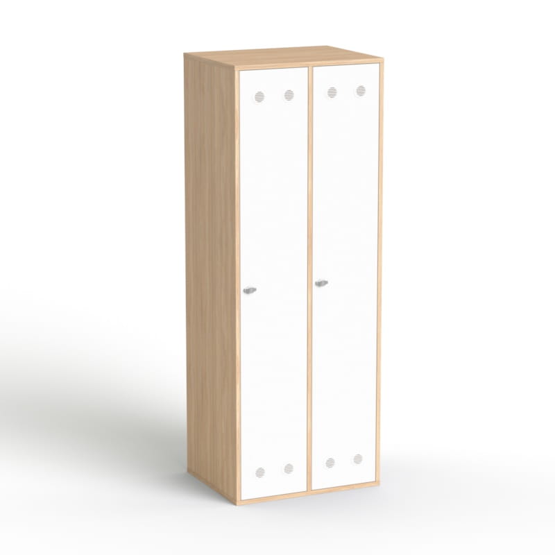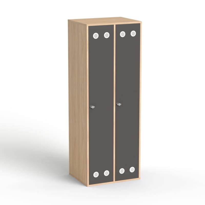 Podwójna szafa BHP do szatni w biurze w kolorze dąb amber – co oferujemy?