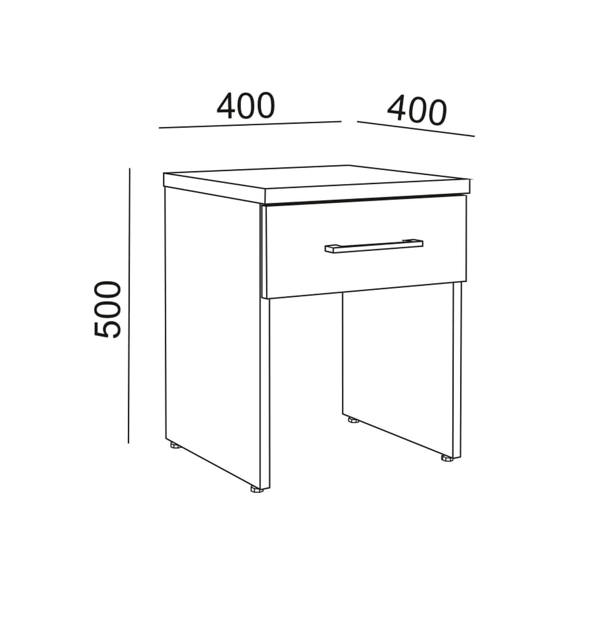 Szafka nocna z płyty melaminowanej z blatem o grubości 25 mm. Szuflada oraz nogi szafki o grubości 18mm. Uchwyt metalowy. Klasa higieniczności płyty w klasie higieniczności E-LE - o zmniejszonej zawartości formaldehydów.